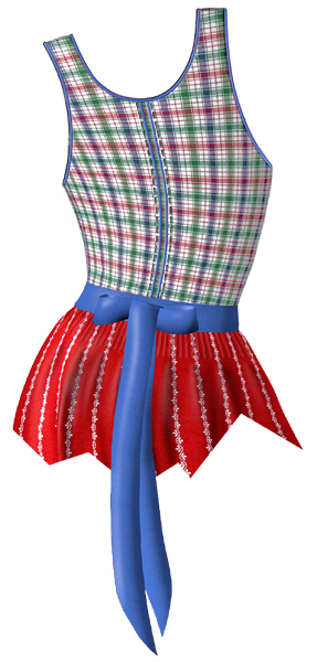 Hals- und Armausschnitt in der Farbe der Schürze passepoiliert, Abgrenzung der Kellernaht mittels Vorstoß in der Farbe der Schürze
