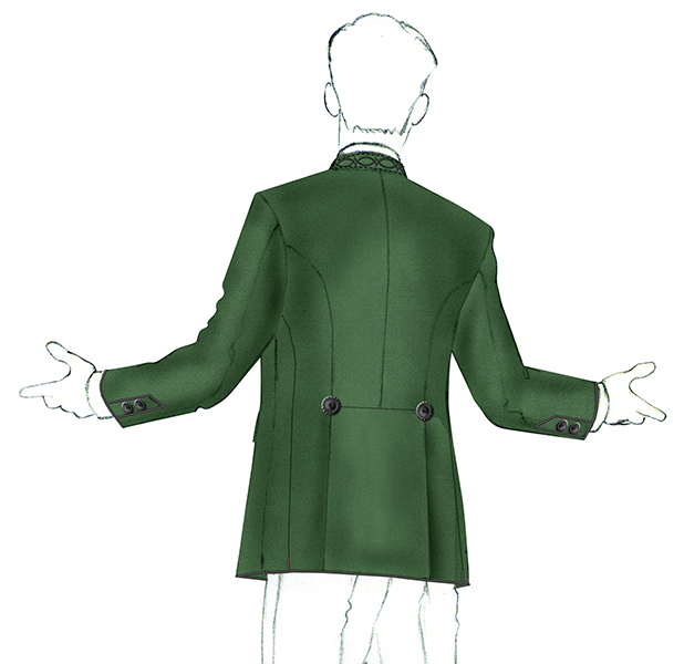 alle Kanten schmal passepoiliert, Stehkragen mit schwarzer Zierstepperei (Ewigkeitszeichen), Ärmelleiste mit 2 Knöpfen